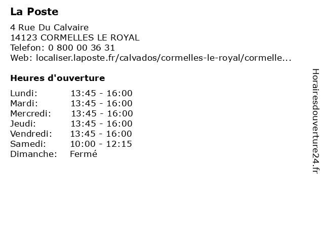 4 RUE DU CALVAIRE. 4 RUE DU CALVAIRE - 14123 CORMELLES LE ROYAL. Aujourdhui mardi 11 Janvier La Poste Cormelles Le Royal est ouvert de 09h à 12h puis de 14h à 17h. Mairiecormellesleroyalfr Contacter la mairie. Rang national 2018 n2 204 -Densité de population 2018.
